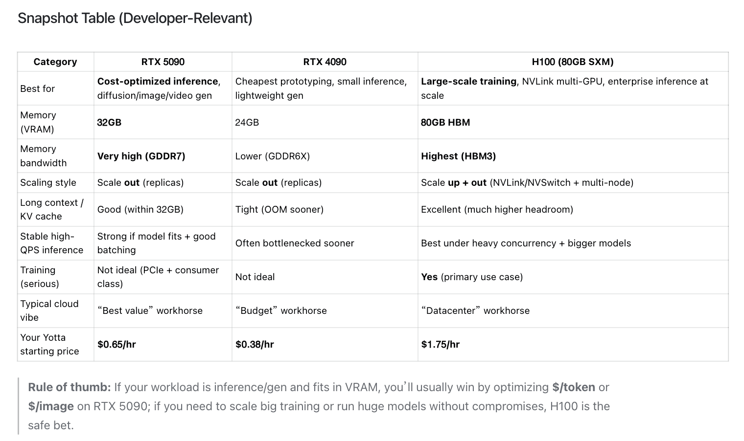 Developer rule: If 5090 achieves even “close enough” throughput for your workload, the cost curve often favors it—especially when optimizing for $/token.