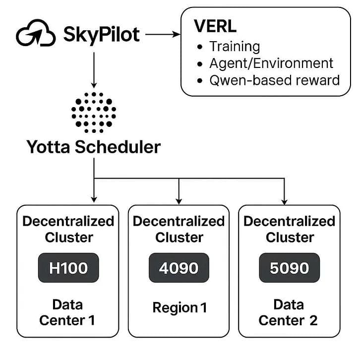 Yotta Labs is preparing to release a decentralized training scheduler that extends beyond traditional cloud-cluster orchestration. While today’s VeRL + SkyPilot integration makes it simple to spin up distributed RLHF training across providers, the next step is breaking data center silos and allowing training workloads to run across heterogeneous, geographically distributed clusters.