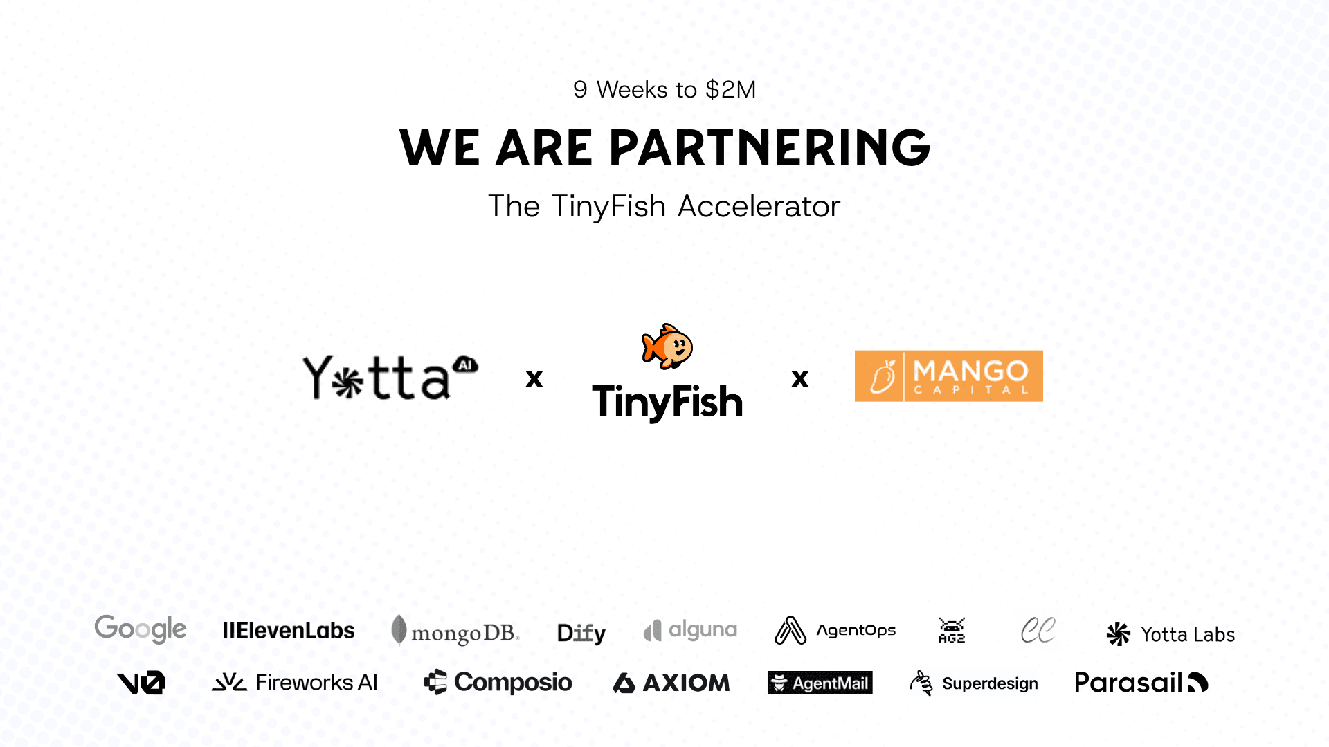 Backed by a $2M seed pool from Mango Capital, the TinyFish Accelerator provides mentorship, operational guidance, and ecosystem access to founders, helping them build, ship, and scale agentic applications that interact with the web and enterprise workflows. With 15+ official partner companies and millions of daily executions powering Fortune 500 use cases, TinyFish offers an unparalleled environment for early-stage innovators.