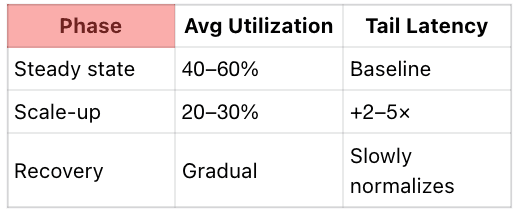 The result is a short-term drop in batching efficiency across the fleet. Even though total GPU capacity increases, effective throughput per GPU decreases during scale events. This is why systems often see lower utilization immediately after scaling up, not higher.